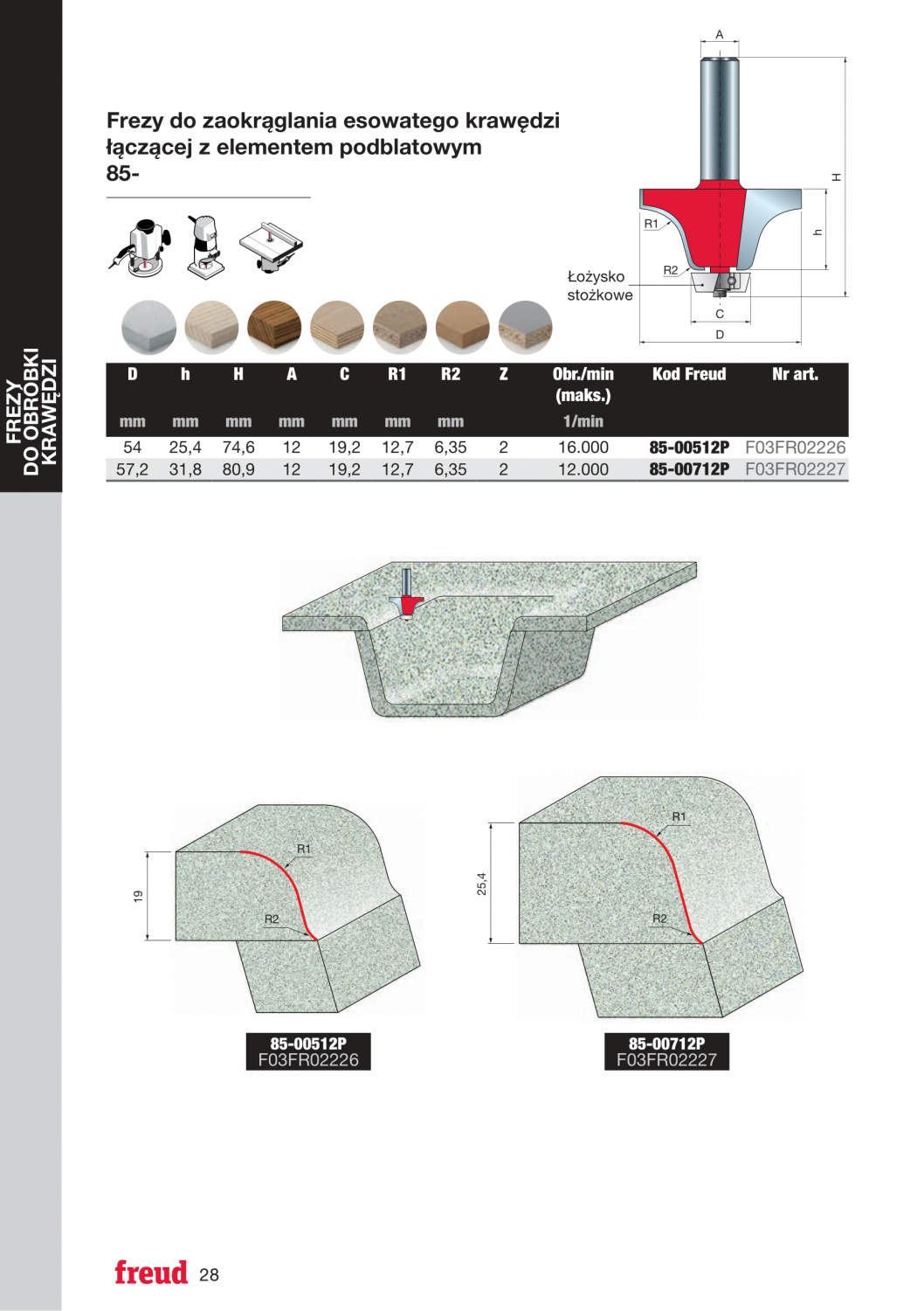 Frez do zaokrąglania esowatego krawędzi łączącej z elementem podblatowym x 57,20 x 31,80 x 80,9 x 12 R=6,35 Z2 FREUD 85-00712P